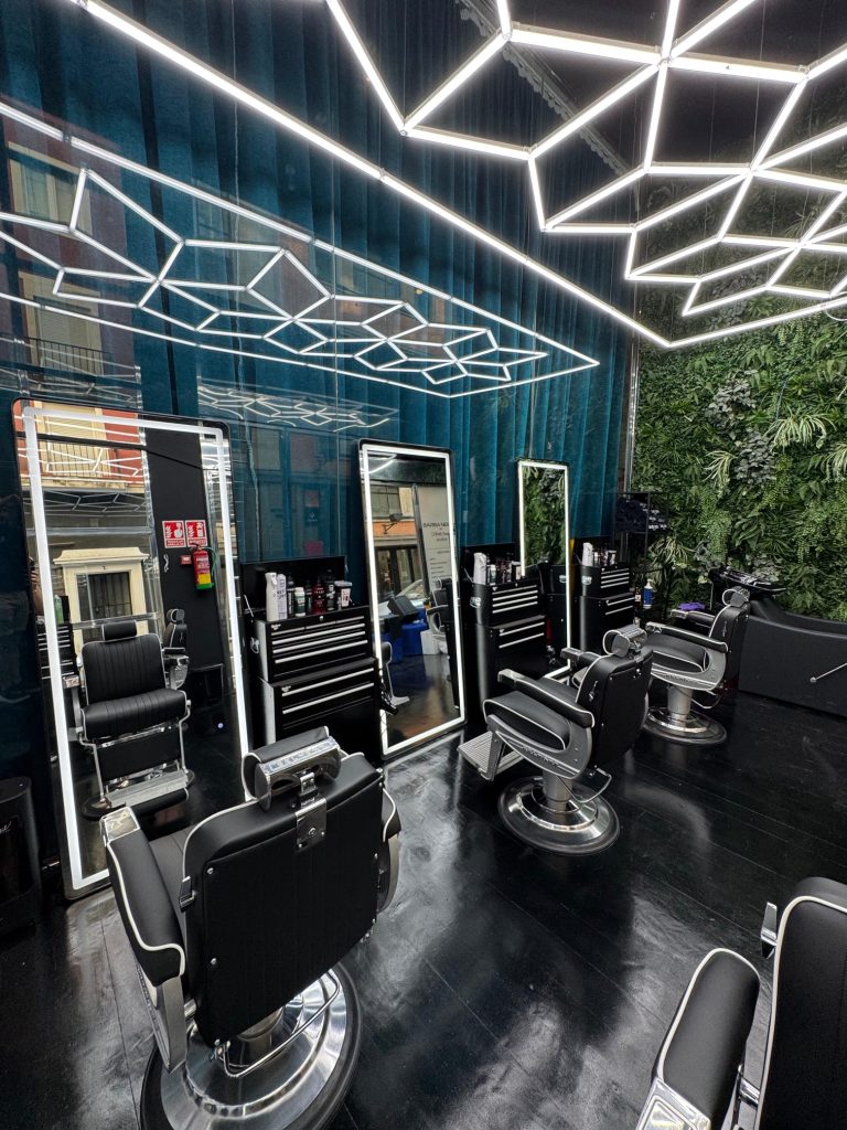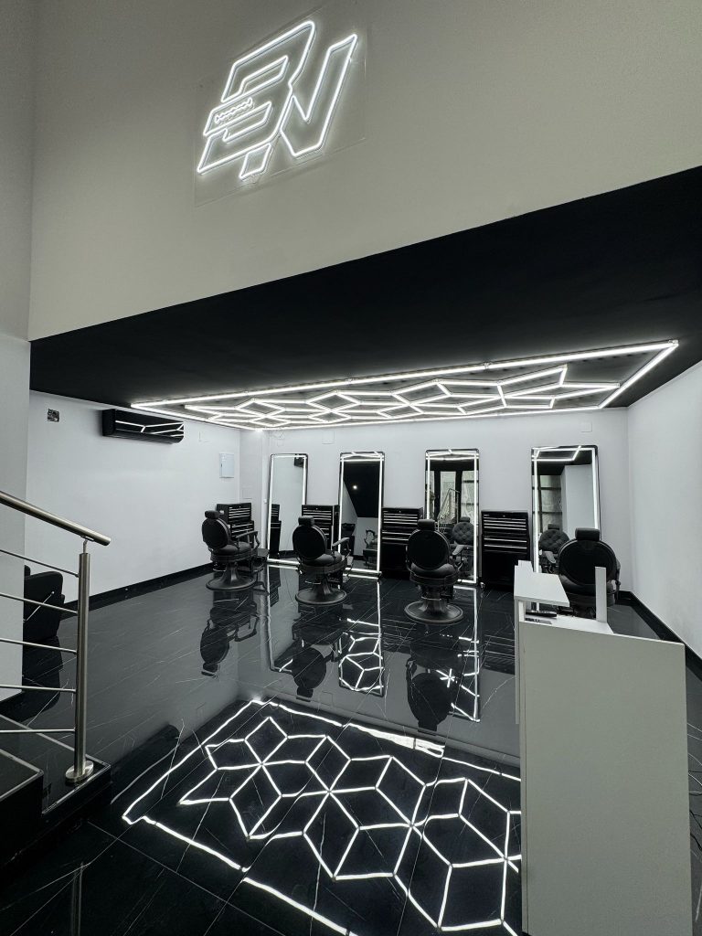 Cada uno de nuestros locales comparte la misma estética: un lienzo en blanco y negro con detalles de neón y acentos turquesa que reflejan energía y modernidad. Nuestros espacios están diseñados para que cada visita se sienta especial: sillones de cuero clásico, luces con personalidad y una atmósfera donde la tradición barbera se fusiona con lo contemporáneo.